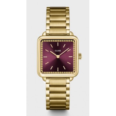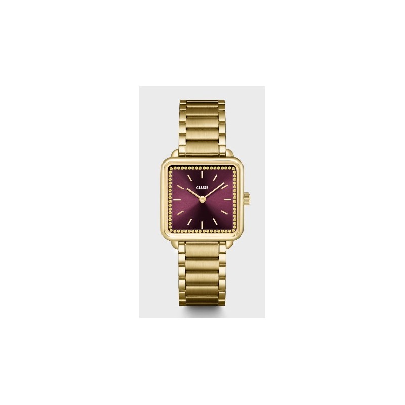 El reloj cuadrado La Tétragone para mujer cuenta con una caja de color dorado de 28,5 mm, una esfera de color vino adornada con piedras de color dorado en la esfera y una correa de acero inoxidable de 16 mm de color dorado.