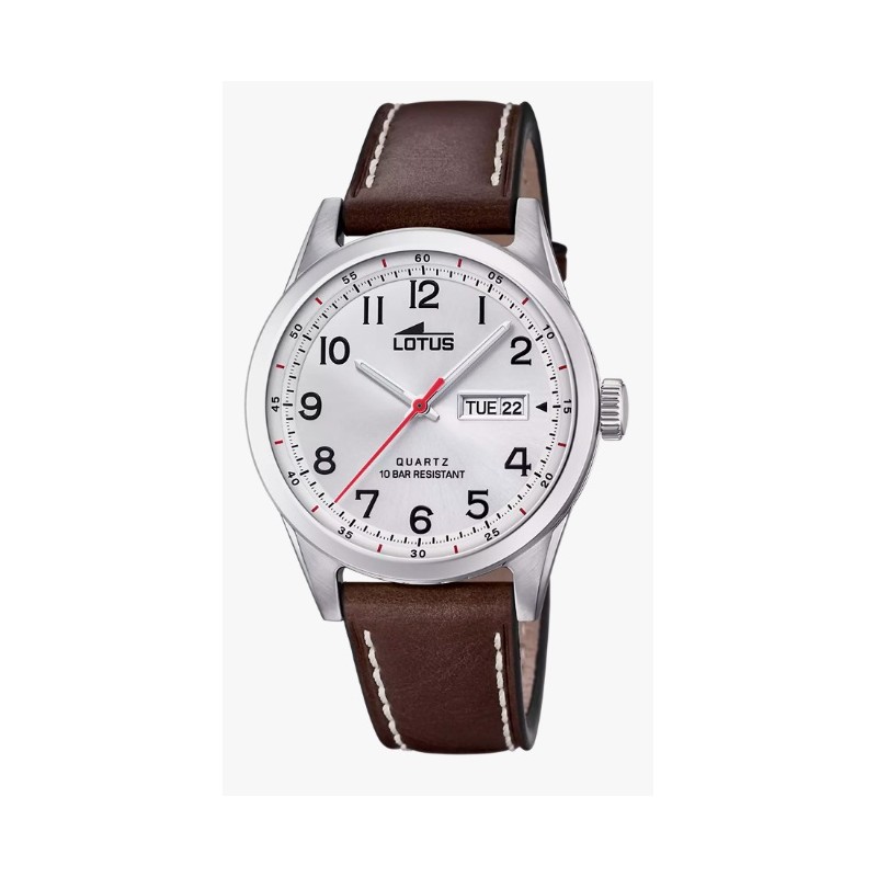 Reloj Lotus para hombre . Se trara de un reloj analógico con movimiento de cuarzo y cristal mineral. El reloj tiene la caja de acero con esfera color plateada con números arabes en negro . El tamaño de la caja es de 42,50 mm de diámetro. Se puede sumergir a 10 ATM y tiene una garantía de 3 años .